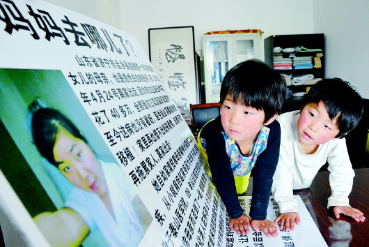 双胞胎女儿看着妈妈的照片,盼望妈妈回家。本报记者 姬生辉 摄