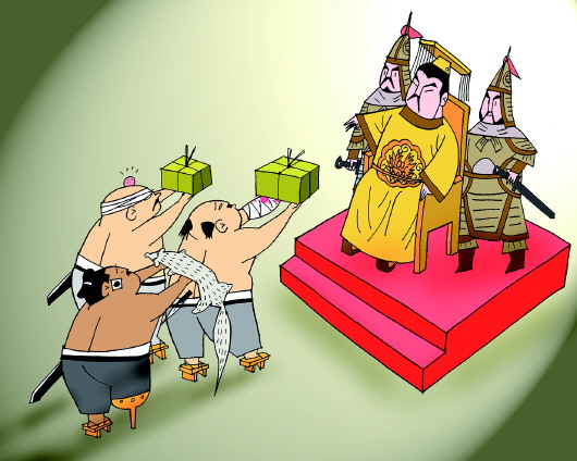 公元五世纪,倭人依旧来中国进贡,但目标已是谋求对朝鲜半岛的主导权。 漫画/侯晓强