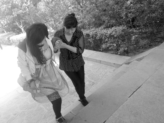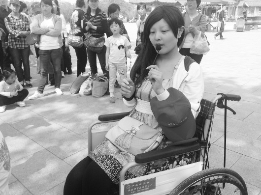 由于刁姿静的腿不方便走路,活动为她安排了一辆车,直接把她送到了大金佛脚下,然后由妈妈推着轮椅在附近游览。第一次来到千佛山的刁姿静特别兴奋,处处都能发现新鲜的景色,不停地指给妈妈看。