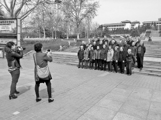4月23日,26位年过古稀的老人在威海市人民广场上合影。他们是老威海一中五级四班1962年的毕业生,相约来场同学聚会,问候一声:老同学,分开的这些年,你过得还好么?