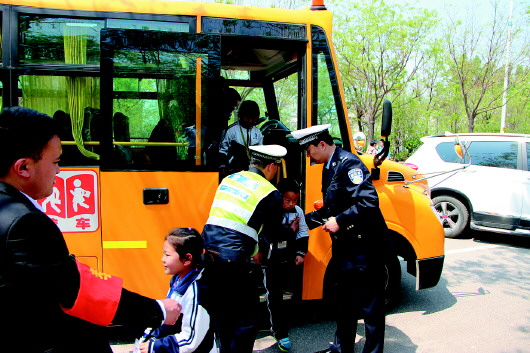 4月23日上午,章丘市公安局交警大队在诺得实验小学组织交通应急演练。演练模拟校车与一轿车发生交通事故,交警大队民警与学校老师第一时间疏散车上学生,以防止发生二次伤害。