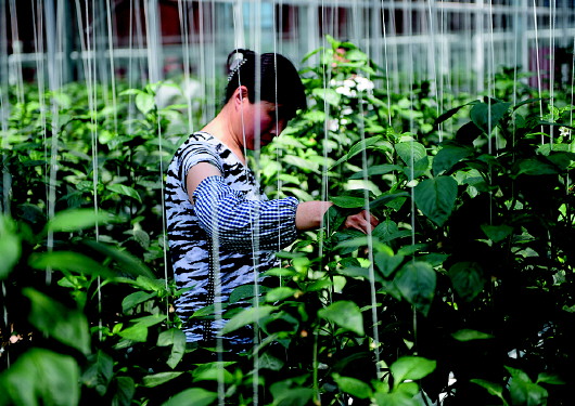 工作人员在照料菜椒。