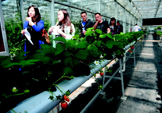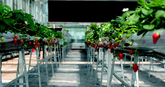 在外形酷似三颗果实的高效生产片区的智能温室大棚里,记者看到光照、温度、湿度等数据实时显示在屏幕上,各类瓜果蔬菜生机盎然地生长着。据介绍,这里调节实现自动化控制,无土栽培、滴灌等现代生产技术的应用,杜绝了化肥、农药的使用,让草莓、西红柿等蔬菜水果品质更佳。