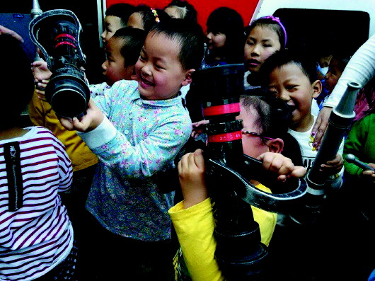 近日,章丘实幼集体桃花山园24名幼儿和家长在老师的带领下,参观了章丘市公安消防大队,与消防员来了一次零距离的接触。图为几个孩子在学习如何使用灭火枪。