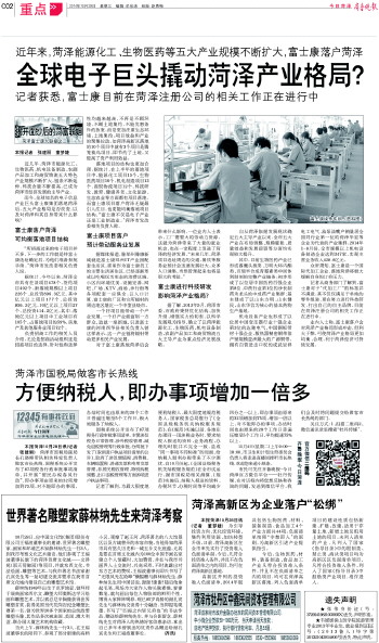 而全球知名的电子信息产业巨头富士康集团落地菏泽后,五大产业格局是否会改变,以及对菏泽和其自身带来什么影响?带着这样的疑问,本报在特别推出的《揭开面纱后的菏富联姻》策划报道中,对菏泽各级相关部门进行了采访。