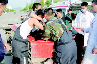 25日,山亭消防大队官兵出警返回途中,在北京路与崇文路交汇处发现一辆电动三轮车发生交通事故侧翻在马路上,且被困群众是一残疾人,双脚被三轮车压住,无法动弹。大队官兵小心把车辆移开,成功救出被困者并送医治疗。 本报通讯员 孔超 本报记者 袁鹏 摄影报道