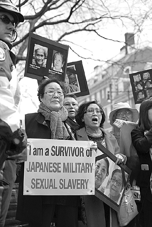 当日,在安倍晋三发表演讲的肯尼迪行政学院正门前,韩国慰安妇受害者李容洙(现年87岁)以及100名哈佛大学的学生举行了静默示威活动。安倍为了躲避示威者,选择与停车场相连的后门进入大厅,演讲结束后又从一侧门退场。