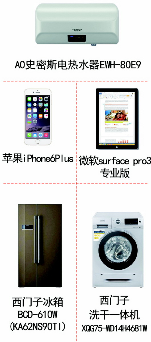 其中西门子冰箱BCD-610W(KA62NS90TI),高效变频压缩机,有效容积610升,市场价14990元,活动价11590元;西门子洗干一体机XQG75-WD14H4681W,洗衣容量7.5kg,市场价8690元,活动价7090元;AO史密斯电热水器EWH-80E9,80L容量,市场价5578元,活动价5278元;苹果手机iPhone6Plus(64GB,电信版),市场价6888元,活动价6588元;另外还有微软surface pro3专业版平板电脑,128G,活动价7071元;海信彩LED55XT900X3DU,活动价9999元;佳能单反相机EOS1200D双镜头套机,活动价3299元;三星NX500微型单电(16-50MM),活动价4699元;华为手机P8高配移动联通双4G,活动价3999元。