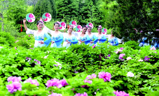 28日,济南植物园,辣妈歌舞团在牡丹园排练实景剧《贵妃醉酒》。 本报记者 周青先 摄