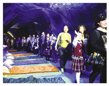 晚上8点,孩子和家长们抑制不住急迫的心情,早早的来到了海底隧道,海洋馆的工作人员已将准备好的睡袋和枕头一字排开,100多米的海底隧道内,一下子热闹起来。