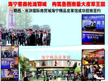 21日,郓邑·水浒国际商贸城海宁精品皮革馆招商签约会胜利召开,成果显著,当场签约40余家。在招商会上,袁明宗作了精彩的演讲,并介绍了水浒国际商贸城项目概况。郓邑·水浒国际商贸城,是山东省重点项目、郓城县全民创业孵化基地、郓城县电子商务产业示范园、郓城县大学生创业园、中国酒类包装文化产业园,项目总体规划108万平方米,经营范围主要是小商品百货、建材五金、海宁皮草等。