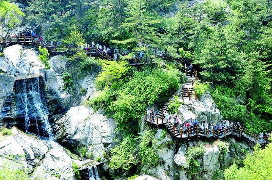 记者从九如山景区了解到,2015年景区新修建了10公里原木栈道。脚踏着木栈道,手扶着木栏杆,时而在木亭里观景,时而又坐在木椅上听瀑布之声,是一件非常惬意的事情。