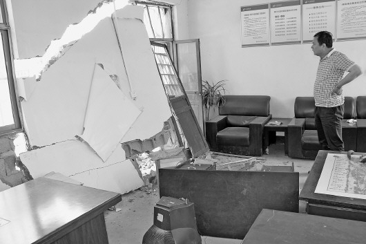 被撞服务站内一片狼藉。 本报记者 曹剑 摄