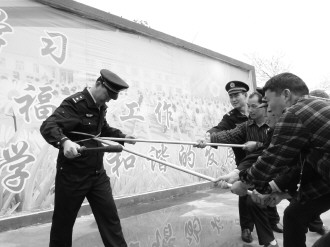 近日,为了增强全体师生的安全意识,徐庄派出所的民警们来到徐庄镇中心小学,普及安全知识,并现场培训了学校工作人员对防暴器具的使用方式。图中,学校工作人员正在民警的培训下练习使用防暴器具。 本报通讯员 李华 本报记者 袁鹏 摄影报道