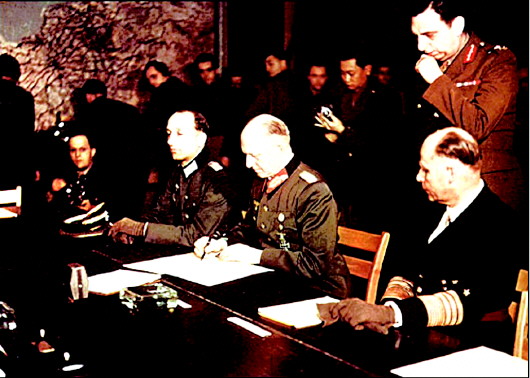 1945年5月7日,德国政府代表约德尔上将(中)在法国兰斯签署德国无条件投降书。