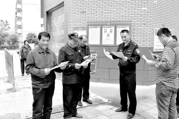 ▲开发区分局丹阳派出所社区民警王志强在向小区保安讲解保安着装规定。