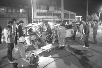 10日21时42分,巨野县公安消防大队光明中队接到报警称:在城区青年路西段,一辆白色小轿车撞向一辆带篷电动三轮车,电三轮上一女子被困,请求救援。接警后,消防官兵立即驱车赶赴现场。