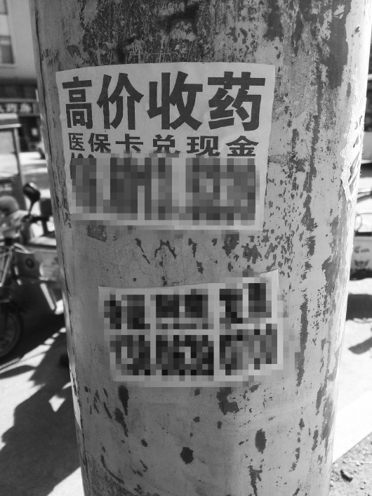 医保卡作为以备不时之需的“救命钱”,却被人利用“套现”,而一些“糊涂”参保者也认为医保卡内的钱没用,在看到“高价回收药品”、“医保卡兑现”等广告时,拿着医保卡到药店刷卡买药,然后以低价卖给收药者获得现金,收药者再将药品转卖赚差价。近日,有读者向本报反映墙上贴着收药小广告,记者随后暗访揭秘收药套现流程。