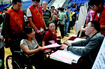13日9时许,招聘会现场人头攒动。41岁的宋女士坐在轮椅上,在招聘展位前挨个询问。宋女士从小患小儿麻痹症。“以前基本上是我妈和姐姐在照顾我,妈妈今年80多岁了,姐姐也有自己的家庭,我想不能再拖累他们了,正好趁这次机会来找个工作。”最后她发现一个手工类辅助工的岗位,与招聘人员交流后,初步达成就业意向。