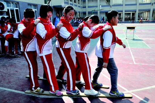作为天桥区的一所外来务工定点学校,济南市天成路小学的同学们在做“同舟共济”游戏,培养学生团结互助的品质。 本报记者 李飞 摄