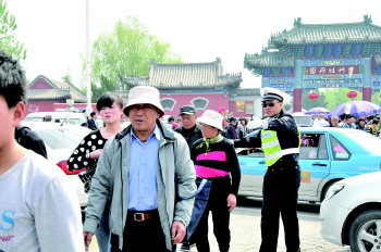第24届菏泽国际牡丹文化旅游节于2015年4月16日在曹州牡丹园举行。4月18日,适逢双休日,花开正盛,菏泽各大牡丹园客流量达到巅峰,已突破10万游客。在牡丹节期间,菏泽交警精心组织,全面落实各项道路交通安全管理工作措施,努力为国际牡丹文化旅游节“护航”。图为4月18日,菏泽交警在曹州牡丹园执勤。 通讯员 蓝昌健 摄影报道