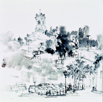 外出采风,画家不愿错过任何景致,那拉堤草原,巴音布鲁克草原的毡房,温岭的溪水,雁荡山、石塘渔村的老房子,丛林中的白云庵,澳门的教堂……都进入了王磐德的画面中,这对于一个人物画家来讲,不仅仅是搜集素材的过程,更是艺术表现手段融汇贯通的过程。山水画的笔墨,人物画的形式创作都是相通的,景物是有生命的,不能把它当成死的东西来表现,通过不同题材的创作,能够生发出更多的艺术可能。在写生的过程中,王磐德根据写生物象的特点,用不同的表现形式来进行创作。有些物象不适合传统的画法,他便吸收西画的技巧,加入现代的创作理念。