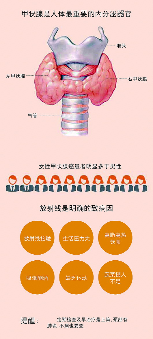 甲状腺癌发病的一个重要特征是多发于女性。李庆说,患者中男女比例约为1:3。甲状腺作为调节人体内分泌的器官,激素分泌差异大概是导致男女发病率差别大的原因,但医学尚无定论。
