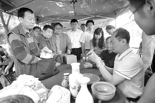 瓷器依然是最多的收藏门类。来自北京故宫的国内著名瓷器鉴定专家吕成龙忙得一上午顾不上喝口水。济南章丘藏友马先生自驾车,用纸箱盛了30多件瓷器前来请吕成龙鉴定,一件件过目后,专家直摆手。旁边围观的藏友有的有些眼力,也一眼看出部分藏品“太新”“太假”。不过也有4件瓷器,被吕成龙鉴定为清末民初或明末清初之物,其中有两件观音坐像,品相做工都不错,在场两位瓷器专家过手看了又看,给马先生很大的鼓舞。