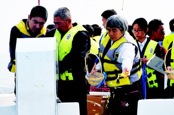 现场 骨灰撒海,亲人寄哀思