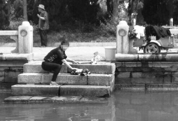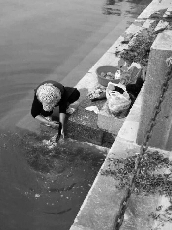 有人在西关桥北湖边洗衣服。(市民杨柳青供图)