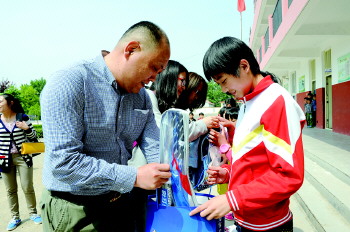 5月15日,日照港三公司女工委人员来到东港区三庄镇日照港希望小学,看望那里的30名贫困女童,并为她们带去必备的学习用品。 (刘军 陈洁)