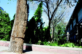 19日下午,记者在现场看到,学校东门一棵榆树被砍得较轻,但树皮也有一个比较深的痕迹。而绿化带内的几棵榆树被砍得较为严重,直到现在树枝上都没长出叶子,被破坏严重的几棵树已经被“植皮”,“植皮”部分已经被包裹起来。