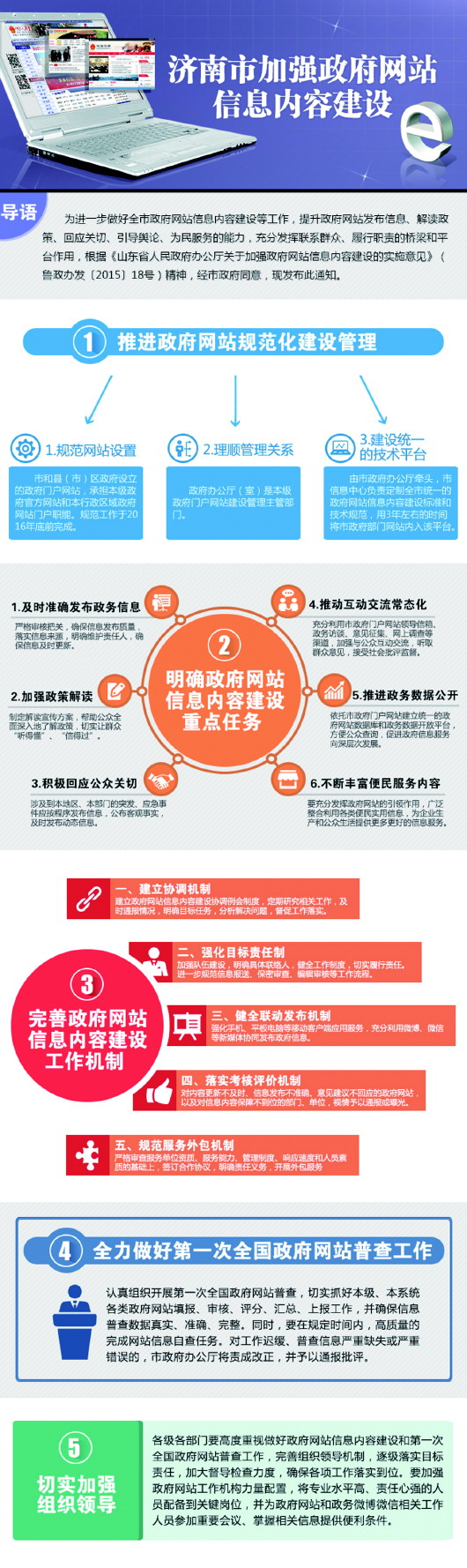 这张彩色的图表分五部分对《通知》进行了解读,每一部分都单独列出了文件中的热点,配上图表,看起来一目了然。“单纯的文字看起来还是相对枯燥,不容易看进去,现在都是读图时代了,用图表进行解读,让人接受起来更容易。”济南市政府网的相关负责人说。