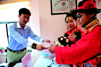 一对新人穿着传统结婚礼服前去领证。本报记者 刘涛 摄