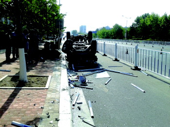 越野车失控翻车撞断两护栏
