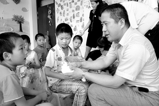 第一次来福利院,活动中丁林厂和赵玉刚不时向福利院的工作人员询问孩子们的生活、学习情况。在活动教室里,看到孩子们如此乖巧懂事,他和赵玉刚加入到孩子们中间,将自己带来的礼物分发到每一个孩子手中。