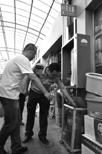 消防工作人员检查市场消防设施。 本报记者 公素云 摄