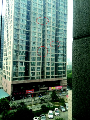 置城中央公园A、B两座住宅楼,外墙的灯带横七竖八挂在墙上,风力稍大时灯带就随风摇晃,非常危险。“11日下午那场大风,从楼上刮下来好几段灯带,直接砸到了楼下空地上,把铁栏杆砸倒了。”置城中央公园田申物业一位工作人员说,最近工程部的维修师傅每天都在拆卸灯带,但断裂位置多、拆卸难度大,外墙仍有很多摇晃不定的灯带。