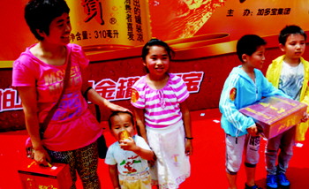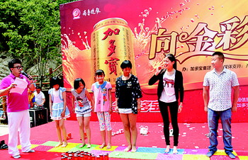值得一提的是,活动现场增加了游戏互动的环节。台下的游客都勇跃参与进“我买几罐加多宝”的互动游戏。通过逐个淘汰的方式,最后的冠军获得了一箱金罐加多宝。同时参与活动的游客都获得了加多宝提供的精美礼品。