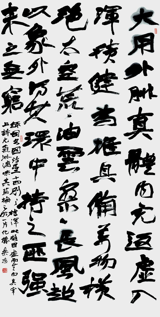 此次国展,蒋乐志的获奖作品选自司空图的《二十四诗品》,其中的“雄浑”、“冲淡”、“纤秾”、“劲健”、“自然”等品评范畴在书法批评中具有重要意义。蒋乐志创作的内容是司空图《二十四诗品》中的第一品“雄浑”。原文是“大用外腓,真体内充。反虚入浑,积健为雄。具备万物,横绝太空。荒荒油云,寥寥长风。超以象外,得其环中。持之匪强,来之无穷。”表达的是一种整体之美,自然之美,含蓄之美,传神之美和动态之美。与康有为的北碑“十美”表达的审美意境颇有融通之意,“一曰魄力雄强,二曰气象浑穆,三曰笔法跳跃,四曰点画俊厚,五曰意态奇异,六曰精神飞动,七曰兴趣酣足,八曰骨法洞达,九曰结构天成,十曰骨肉丰美。”蒋乐志表示,诗歌创作与书法创作时的心理状态十分接近,历代诗论与书论的相互贯通之处比比皆是,我们从中可以看出书法和文学批评范畴的共通关系,也反映出相同文化背景下产生的文艺在美学理念上的内在一致性。“读过‘雄浑’篇之后我感受颇深,因此我把它作为书写内容,想以作品的雄强形式来表现和呼应文字内容。”