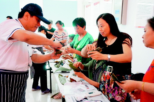 蓝天苑社区请来慕斯娜蛋糕店的经理为居民教课,凡是来到现场的群众都可以领取一份包粽子的原材料和一个热腾腾的粽子,先品尝后制作。活动开始前慕斯娜经理先讲述了两个关于端午节的故事,然后开始教大家包粽子,放上两把米、一个枣,严严实实地包起来,就是一个粽子。
