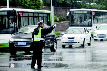 交警在雨中疏导过往车辆。 本报记者 杨广帅 摄