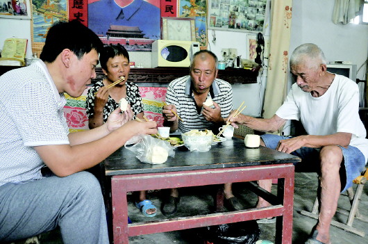 孙希贤(左三)一家人和秦普五(右一)在吃饭。