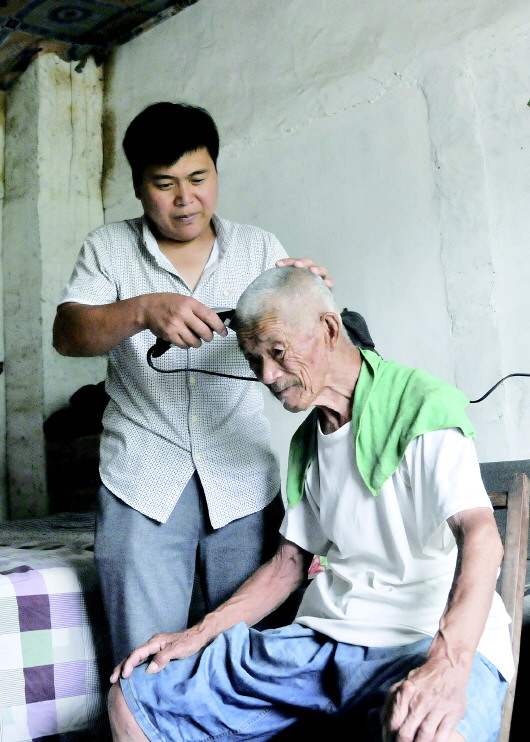 孙义涛在给秦普五剃头发。