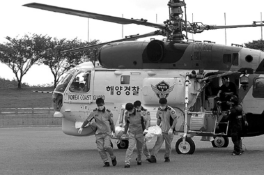 ◤6日,韩国海警人员转移“海豚”号钓鱼船遇难乘客的遗体。 新华/路透