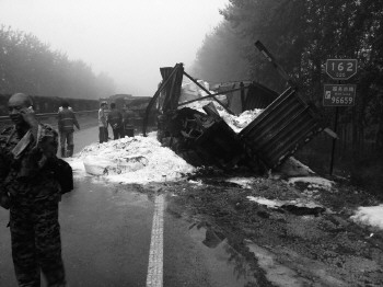 “因为硫磺是化学物品,在燃烧时会产生大量有毒气体,我们马上对事故现场200米范围内实施强制封闭,并设置警示标志。”路政人员说,现场火势蔓延很快,几乎烧遍了整个车身,且已经蔓延到油箱非常危险,消防人员“全副武装”利用泡沫对明火部位进行喷射灭火。此外,由于粉状的硫磺不溶于水,漂上来的粉末在水上还会着火,暴露在空气中的粉末还能引起轰燃,路政人员从附近拉来一车沙土,撒到硫磺上,阻断硫磺与空气接触。