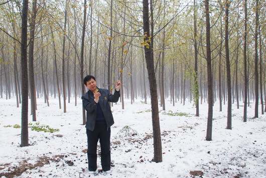 闫家河在树林里观察雪后害虫死亡情况。(资料片)