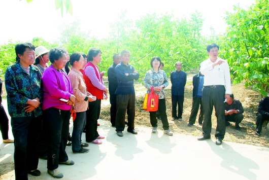 闫家河在张坊乡核桃培训会上为种植户作技术指导
