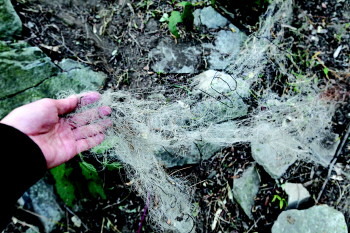14日早上,记者在山途中发现的废弃鸟网。
