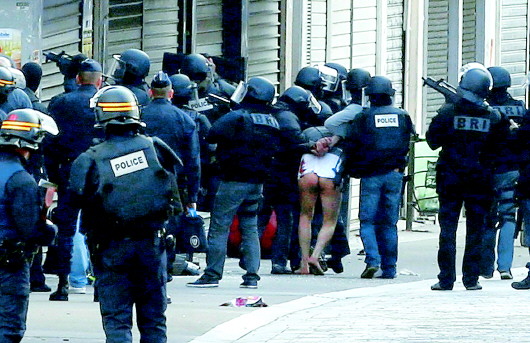 18日,一名男子在法国巴黎郊区圣但尼市的反恐突击行动中被逮捕。为防止其引爆自杀式炸弹腰带,该男子被警方脱掉裤子后才带走。 新华/路透